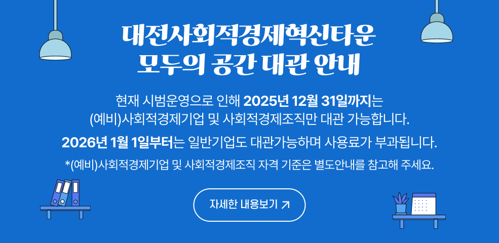 현재 시범운영으로 인해 2025년 12월 31일까지는 (예비)사회적경제기업 및 사회적경제조직만 대관 가능합니다. 2026년 1월 1일부터는 일반기업도 대관가능하며 사용료가 부과됩니다. *(예비)사회적경제기업 및 사회적경제조직 자격 기준은 별도안내를 참고해 주세요.