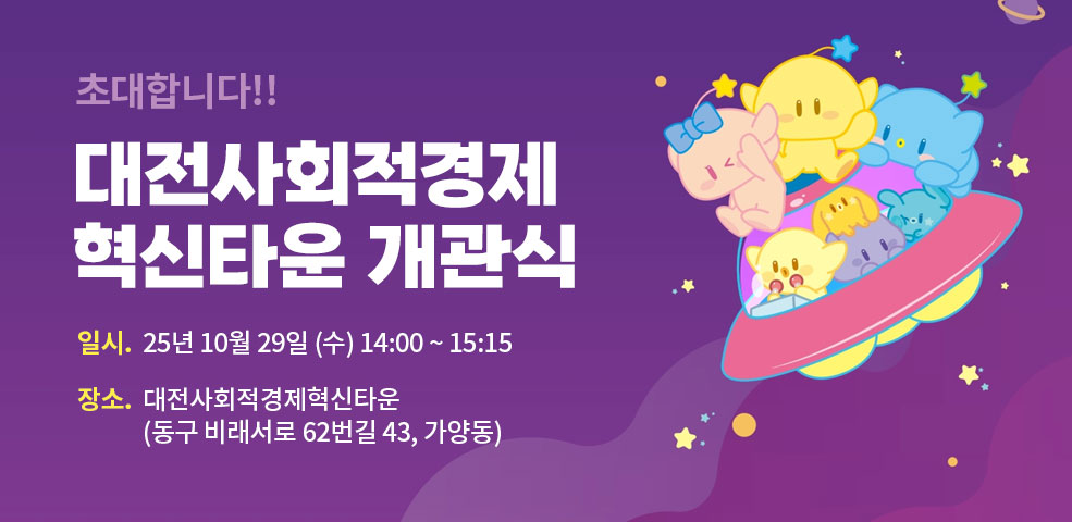 주 소 대전광역시 동구 비래서로 62-47 (가양동) 모집대상 「대전광역시 사회적경제 육성 및 지원 조례 제2조 3~4항」 관내 사회적경제기업 및 사회적경제연대조직 접수기간 2025년 5월 19일(월)부터 ~ 공고 변경 시까지 접수방법 대전일자리경제진흥원 사회적경제혁신센터 envelope ururuu12@djbea.or.kr 문 의 042-380-3032